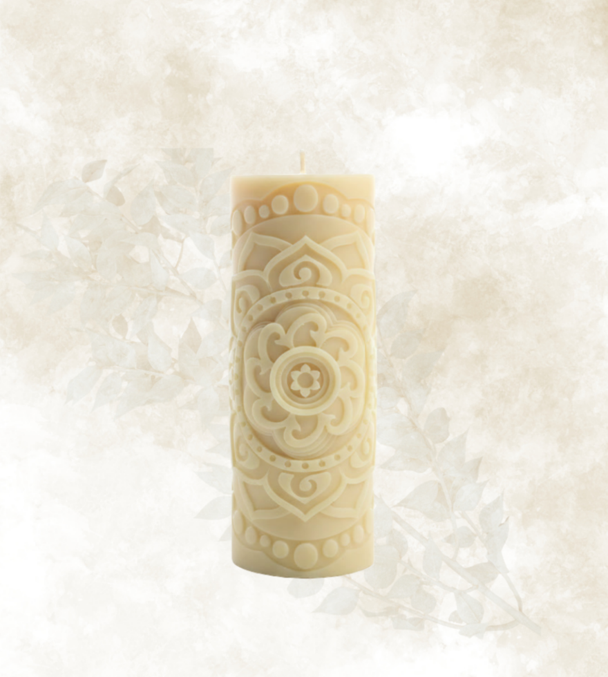 - Volně stojící ornamentální svíčka z kokosového vosku, ručně vyráběná v malých sériích.